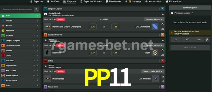 O PP11 oferece uma grande seleção de opções de apostas em e-sports com probabilidades competitivas